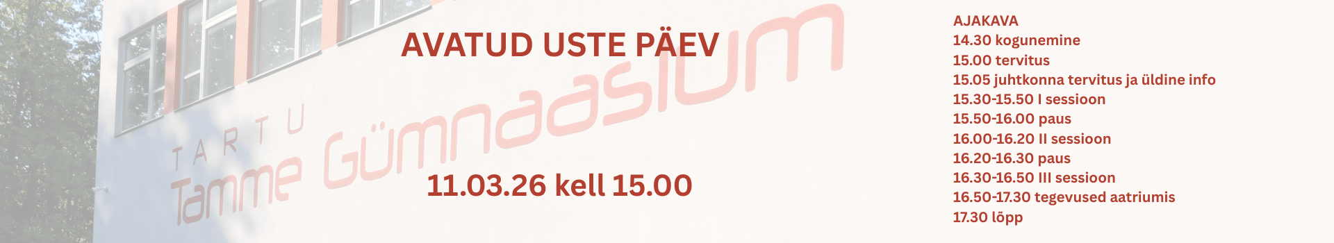 Tartu Tamme Gümnaasium ootab põhikooli lõpetajaid avatud uste päevale, mis toimub kolmapäeval, 11.märtsil algusega kell 15.00. Ajakava: 14.30 avame uksed 15.00 tervitus 15.05 juhtkonna tervitus ja üldine info 15.30-15.50 I sessioon