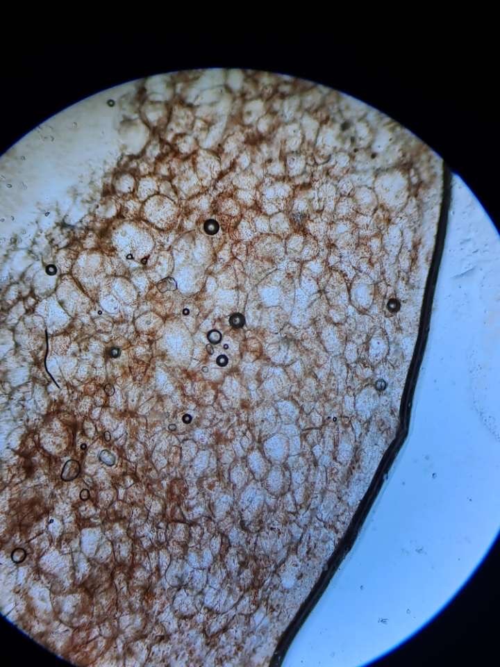 *paprika parenhüümi rakud kromoplastidega (suured läbipaistvad ringid, täidetud punaste täppidega)