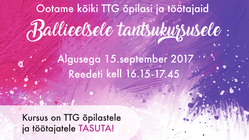 Reedel, 15. septembril alustab ballieelne Tantsukursus. Kursus on TTG õpilastele ja töötajatele tasuta, seda juhendavad Helina Harro ja UPT raames Grete-Brigitte Kalda. Täpsem info Stuudiumis.