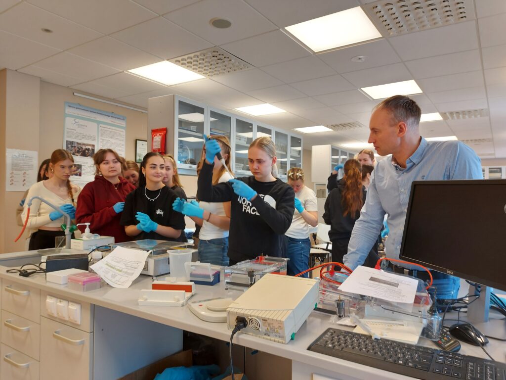 5.-7. märtsil 2024 toimusid kooli laboris 12. loodus- ja meditsiiniklassidele traditsioonilised biotehnoloogia praktikumid. Juhendasid Kaarel Krjutškov (Tervisetehnoloogiate Arenduskeskus, TÜ; TTG vilistlane) ja Angela Peeb (TÜ; TTG vilistlane), keda praktilisel ettevalmistamisel aitas Krõõt Arbo (TÜ Tehnoloogiainstituut, TÜ TI), assisteerisid õp Leili Järvsoo ja Urmas Tokko. Praktikumide sisu oli samuti traditsiooniline: