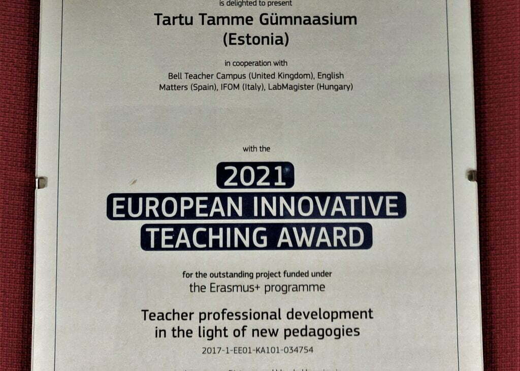 Tamme gümnaasium kuulub nüüd esimese 104 Euroopa kooli hulka, keda Euroopa Komisjon tunnustas uuendusmeelsuse ja hübriidõppe edendamise eest. Auhinnatseremoonia toimus 20. oktoobril veebisilla vahendusel ja Eestit esindasid lisaks meie koolile veel Paide Hillar Hanssoo põhikool ning Kuressaare ametikool.