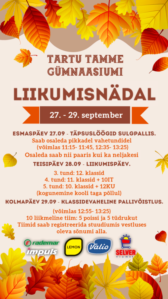 27.-29. septembril toimub Tamme Gümnaasiumis liikumisnädal. Kogu info siinsamas plakatil. Ootame julgesti osa võtma!