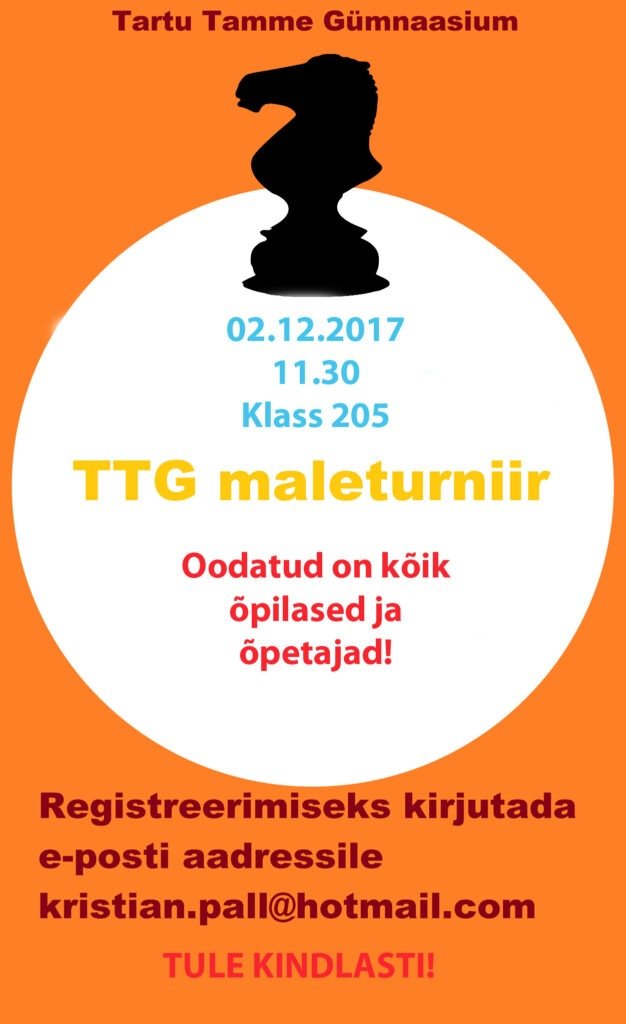 2. detsembril kell 11:30 toimub Tartu Tamme Gümnaasiumis klassis 205 maleturniir.
