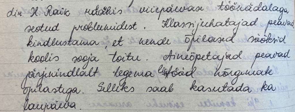 Viia katseliselt sisse viiepäevane töönädal 40 minutiliste tundidega tehti 1987. aasta augustis kooli töötajate koosolekul. Kuu hiljem rääkis direktor Helve Raik seotud probleemidest. (Tartu V Keskkooli töötajate nõupidamiste protokoll 30.09.1987)